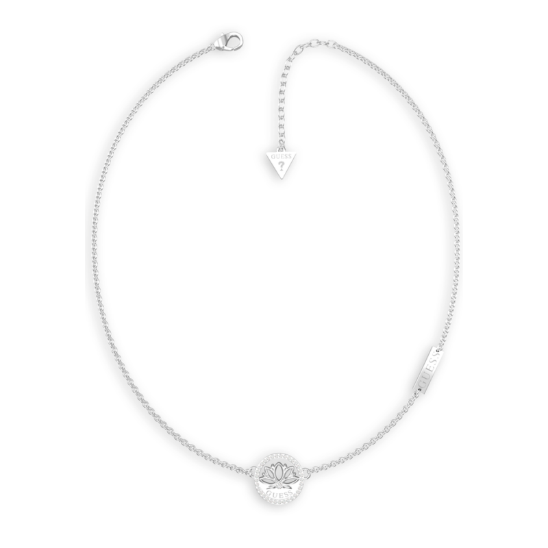 Collar de acero para mujer de la marca Guess. Cadena fina con pieza central con la flor de loto en relieve. En acabado plateado brillante, la marca Guess representa la modernidad y el diseño, y se posiciona como una marca siempre al día de las tendencias más actuales y rompedoras.